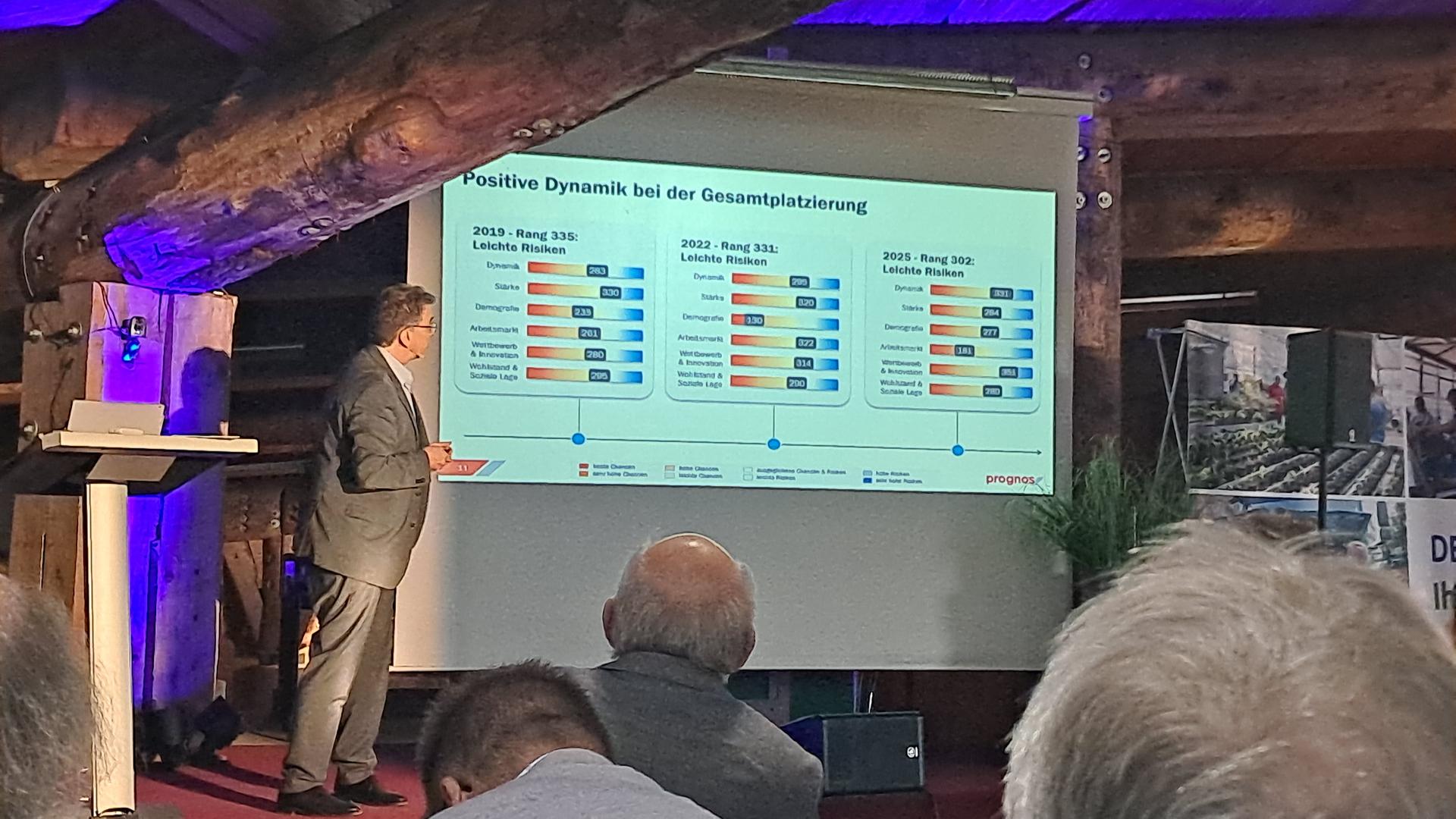 Dr. Olaf Arndt, Partner und Bereichsleiter Region und Standort der Prognos AG, eröffnete die Veranstaltung mit einem Impulsvortrag. Auf Basis von 31 Indikatoren stellte er den neuen Zukunftsatlas 2025 vor, der alle drei Jahre erscheint und bundesweit als wichtiger Wegweiser für Politik, Investoren und Verwaltungen gilt. Verglichen werden darin 400 Landkreise und kreisfreie Städte in Deutschland.