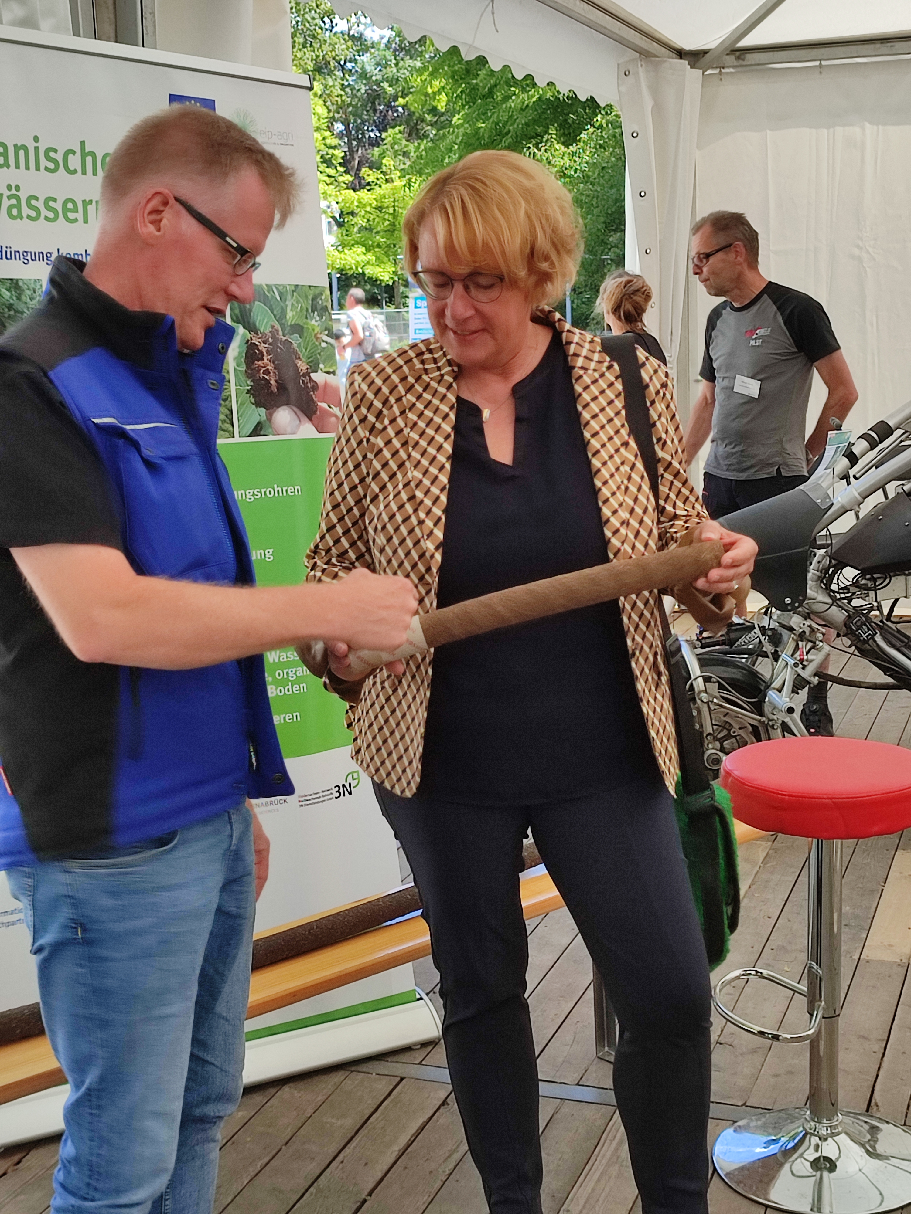 Auf Einladung des niedersächsischen Landwirtschaftsministeriums konnte unser „ Chefkonstrukteur“ Rolf Sieling nun am Samstag und Sonntag auf unserem Messestand einige Prototypen vorstellen. Das riesige Interesse der Besucher hat uns überrascht und ist gleichzeitig ein großer Ansporn, an dem Projekt intensiv weiterzuarbeiten. Sowohl zukünftige Anwender aus den Bereichen Landwirtschaft und Gemüsebau als auch private Gartenbesitzer wollten sich sehr genau über die Einsatzmöglichkeiten dieses völlig neuartigen Bewässerungs- und Düngesystems informieren. Viele Studierende aus unterschiedlichen Fachbereichen kamen neugierig auf unseren Stand und es entwickelten sich viele, teils auch kontroverse Diskussionen. Prominenteste Gäste waren die Ministerin für Landwirtschaft, Ernährung und Verbraucherschutz , Frau Otte-Kinast sowie der Staatssekretär, Herr Prof. Dr Theuvsen Beide waren sehr interessiert an den Einsatzmöglichkeiten des Rohres und unterstrichen die Bedeutung des Projektes aufgrund seiner Ressourceneffizienz bei der Realisierung des „Niedersächsischen Weges“. Frau Otte-Kinast betonte auch die die internationale Dimension des Projektes, da Wasser- und Nährstoffeffizienz in vielen Gebieten der Erde eine zunehmende Bedeutung erfahren und damit dieses niedersächsische Projekt einen nachhaltigen Beitrag zur Nahrungsmittelproduktion weltweit leisten könnte.