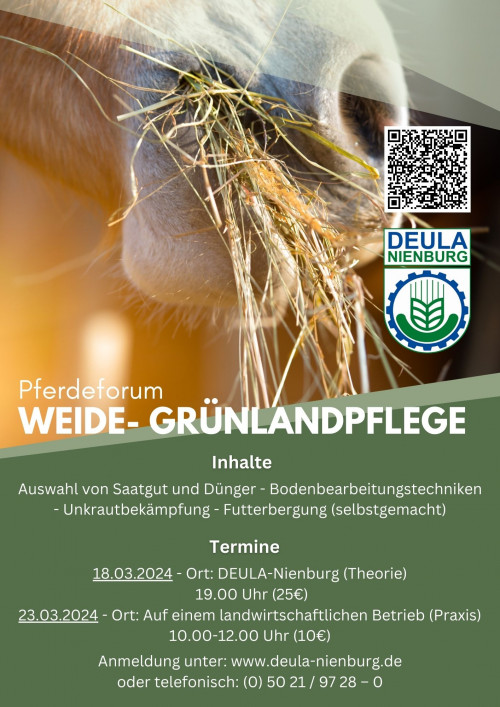 Dieses Jahr präsentieren wir unseren Kunden etwas Neues: Das Pferdeforum 2024 mit dem Schwerpunkt Weide- und Grünlandpflege. Die DEULA- Nienburg bietet ein Forum mit zwei Terminen an, die sich mit verschiedenen Themen rund um die Pferdehaltung beschäftigen. Die Schwerpunkte umfassen die Auswahl von Saatgut und Dünger, Bodenbearbeitungstechniken, Unkrautbekämpfung und die Futterbergung (selbstgemacht).