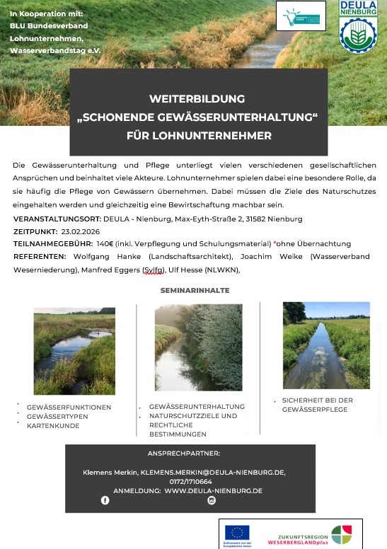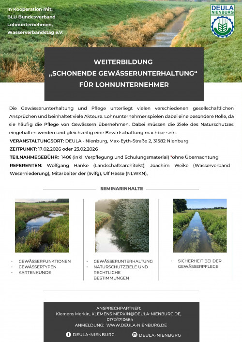 Die Gewässerunterhaltung und Pflege unterliegt vielen verschiedenen gesellschaftlichen Ansprüchen und beinhaltet viele Akteure. Lohnunternehmer spielen dabei eine besondere Rolle, da sie häufig die Pflege von Gewässern übernehmen. Dabei müssen die Ziele des Naturschutzes eingehalten werden und gleichzeitig eine Bewirtschaftung machbar sein. Zeitpunkt 23.02.2026,