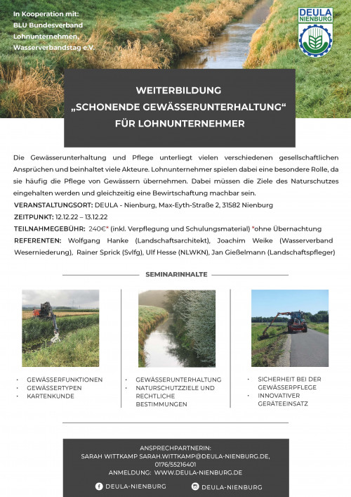 Die Gewässerunterhaltung und Pflege unterliegt vielen verschiedenen gesellschaftlichen Ansprüchen und beinhaltet viele Akteure. Lohnunternehmer spielen dabei eine besondere Rolle, da sie häufig die Pflege von Gewässern übernehmen. Dabei müssen die Ziele des Naturschutzes eingehalten werden und gleichzeitig eine Bewirtschaftung machbar sein. Dies kann zu Konflikten zwischen den Ansprüchen der Ökologie und der Pflege führen. Eine schonende Gewässerunterhaltung bedarf spezielles Fachwissen, welches in dieser zweitägigen Weiterbildung vermittelt werden soll.