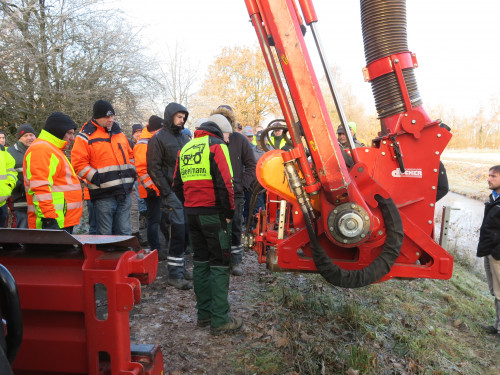Bei der anschließenden Exkursion konnte der Mähkopf mit Schnittgutaufnahme im praktischen Einsatz begutachtet werden. Es gab einen regen Austausch mit den Teilnehmenden und großes Interesse an der Technik.
